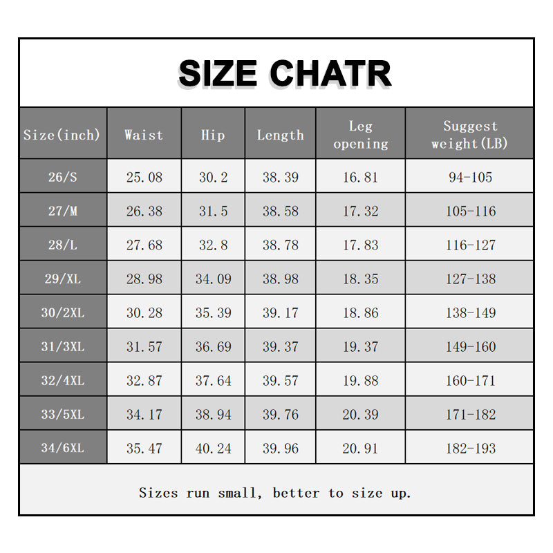 Sizes: 26/S, 27/M, 28/L, 29/XL, 30/2XL, 31/3XL, 32/4XL, 33/5XL, 34/6XL