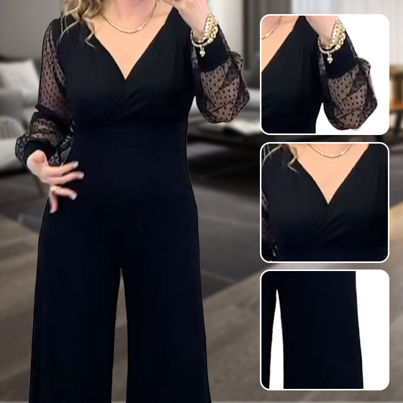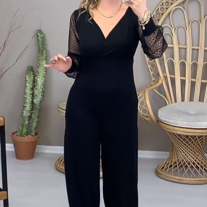 Package Includes:1*V-Neck Waist-Cinching Jumpsuit with Mesh Sleeves