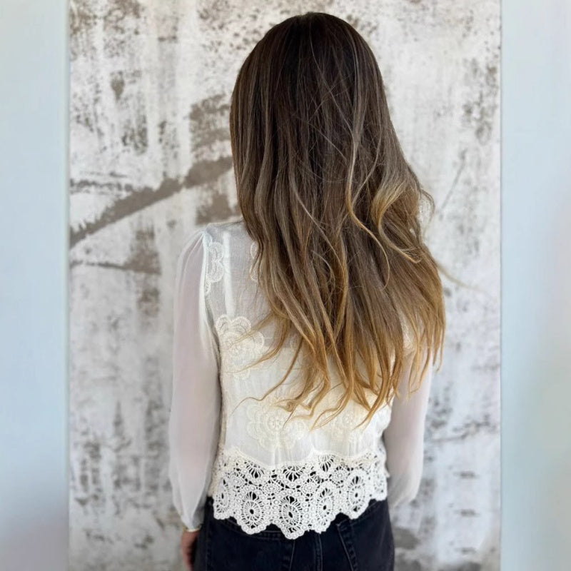 DELICATE LACE & EMBROIDERY DESIGN - Intricate floral lace patterns adorn the blouse, blending delicate embroidery with sheer fabric for an elegant, feminine silhouette that highlights sophistication.