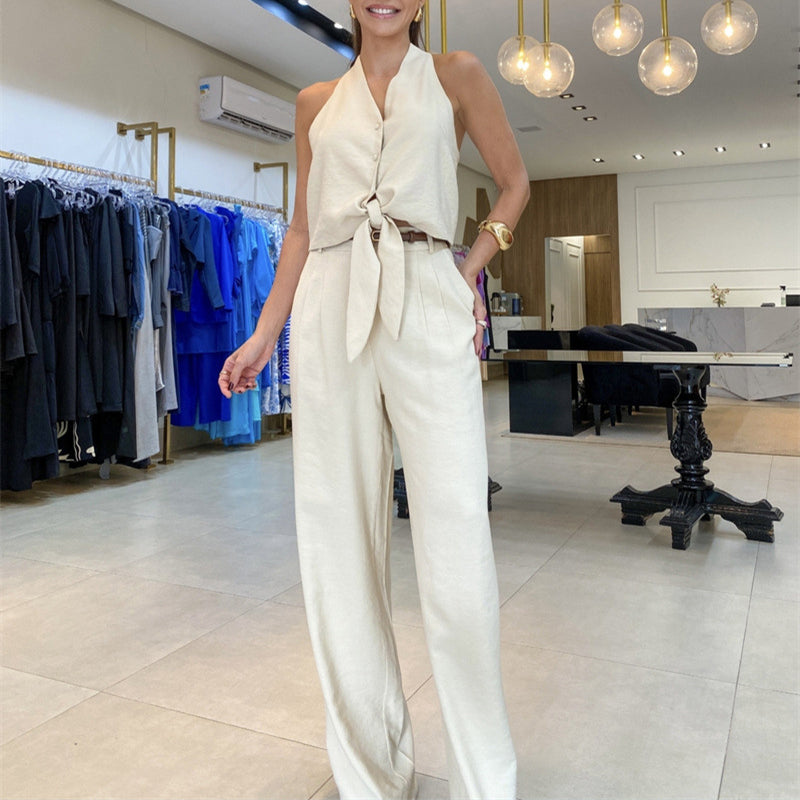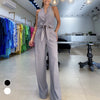 CHIC TWO-PIECE COORDINATED DESIGN: This elegant set features a sleeveless halter top paired with high-waisted wide-leg trousers, offering both versatility and effortless style—wear them together for a polished look or separately to create new outfits.