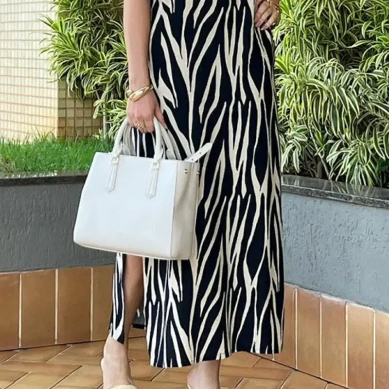 GEOMETRIC PRINTED AND COLOR-BLOCK DESIGN: Featuring a stylish geometric print combined with a bold color-block pattern in white and black, this dress makes a statement. It offers a contemporary, chic look perfect for everyday wear.
