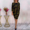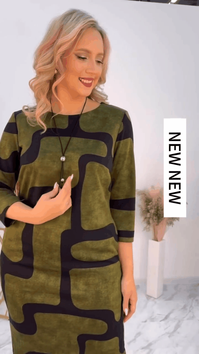 This chic dress features a modern design with a striking geometric pattern in earthy tones, combining style and comfort. It flatters the figure with three-quarter sleeves and a fitted silhouette while maintaining a relaxed vibe. The sleek lines and unique color scheme make it especially suitable for mature women and those with a sense of style, highlighting femininity and elegant taste.