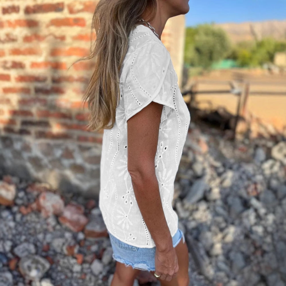 1 * Women's V-Neck Embroidery Hollow Short Sleeve Shirt